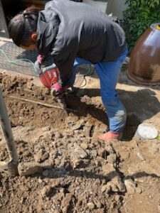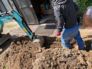 公共桝への距離なども考えながら掘削を行い、途中コンクリが出てきたりと苦戦する場面も。しかし、さすがは現場の職人たち!